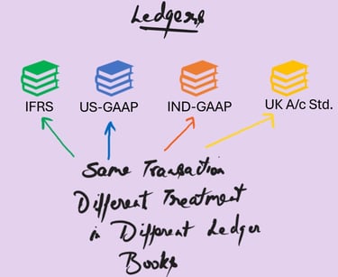 Now days, Computer Softwares (ERP - Enterprises Resource Planning Softwares) can maintain multiple Ledgers Books in same software, in same instance, in real time.